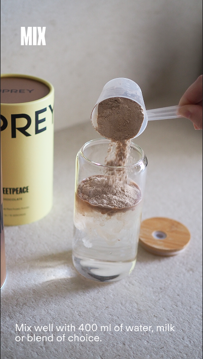 Agrega 1 dosis (30g) de proteína a 400 ml de agua, leche o batido.
